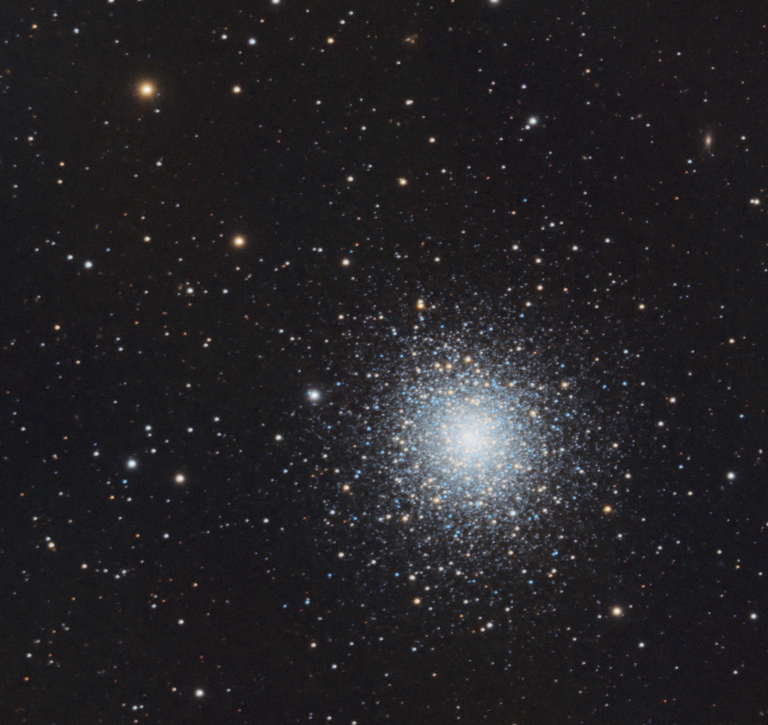 Sometimes called the “Cat’s Eye Galaxy,” this is M94 – about 16 million light years away in the constellation Canes Venatici. You can barely see its faint outer ring surrounding it here, as well as several very distant background galaxies. It’s notable for challenging our understanding of the universe – it appears to have very…